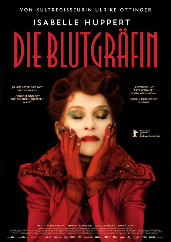 Zwischen Irr-Sinn und Aber-Witz: DIE BLUTGRÄFIN von Kultregisseurin Ulrike Ottinger und mit Texten von Elfriede Jelinek ist die Mutter aller Kinofeste, ein groteskes Gelage grandioser Grande Dames, die nach dem roten Elixier des Lebens streben und auf der Umlaufbahn der Deutungen absolut uneinholbar sind. Neben Isabelle Huppert spielen zu Höchstform auf: Birgit Minichmayr, Thomas Schubert, Lars Eidinger, Conchita Wurst, Karl Markovics und viele mehr. Ein exzellentes, spielfreudiges Ensemble in einer federleichten Vampirkomödie, die schon jetzt unsterblich ist.